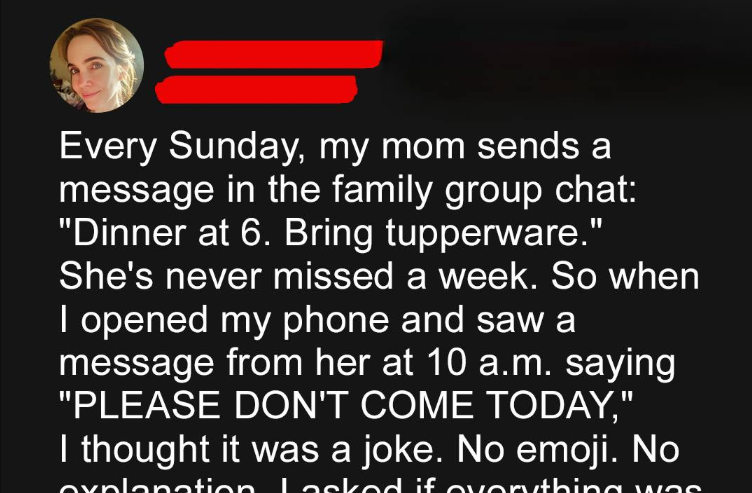 Every Sunday, without exception, my mom prepared a family dinner. It was more than a meal—it was our ritual, a cherished way to stay bonded after Dad’s passing three years earlier. So when she sent an abrupt text, “Stay home today, please,” with no further details, unease settled in. My brother and I couldn’t brush ...