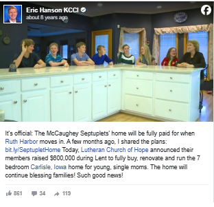 The state of Iowa also stepped forward, offering full scholarships to any public university in the state for each of the seven children when they became of age.